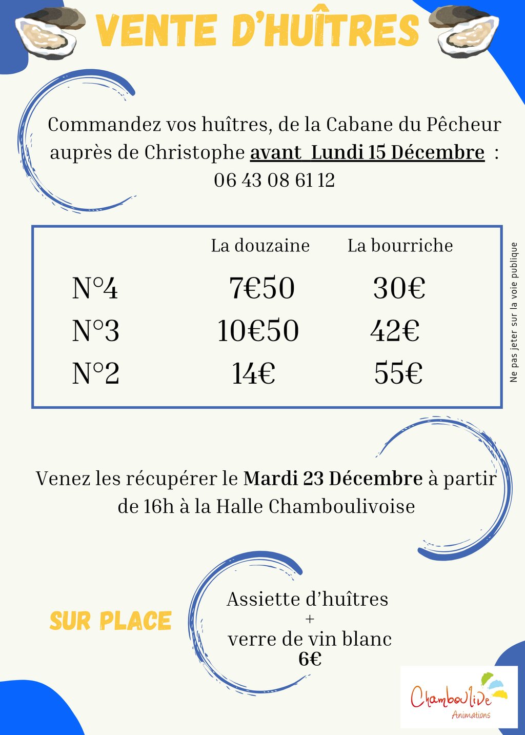 Commandez auprès de Christophe vos huîtres (provenance : La Cabane du Pêcheur) : 06 43 08 61 12.