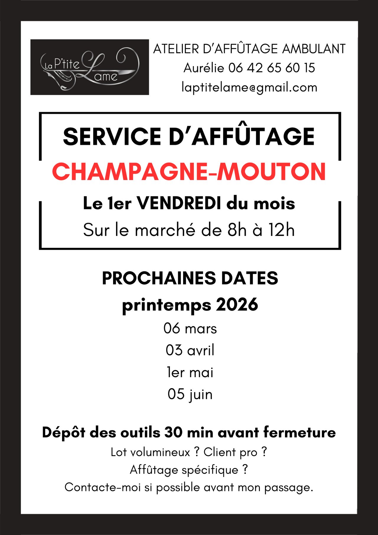 Retrouvez chaque premier vendredi du mois, votre service d'affûtage ambulant lors du marché du vendredi matin (place du château)