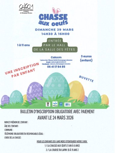 Alors venez remplir votre panier de nombreux chocolats avec la chasse aux oeufs organisée par le CALCCM le dimanche 29 mars de 14h30 à 16h00 dans la salle des fêtes.