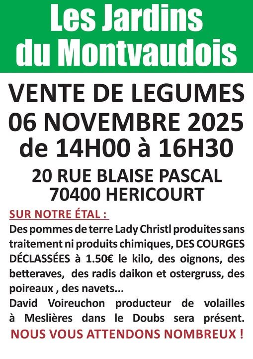 L'association Les Jardins du Mont Vaudois organise une vente de légumes le jeudi 6 novembre de 14 heures à 16h30 (20, Rue Blaise Pascal - 70400 HERICOURT).
