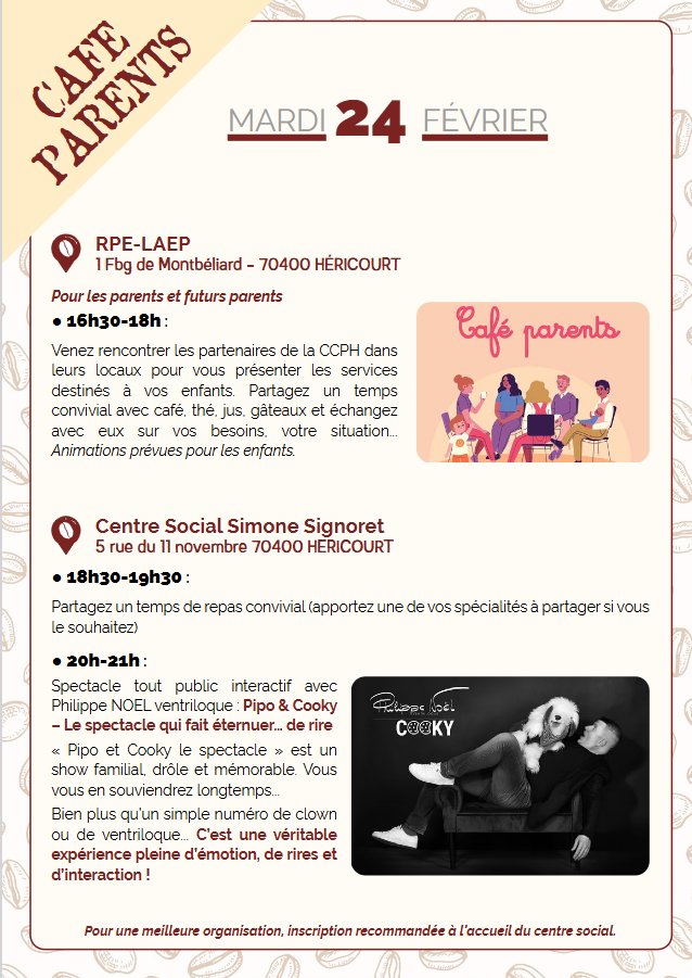 Cette rencontre se déroulera au Lieu d’accueil enfants-parents (1 faubourg de Montbéliard 70400 Héricourt), puis un repas et un spectacle (GRATUIT) vous seront proposés au Centre social municipal Simone Signoret (5 rue du 11 Novembre 70400 Héricourt).