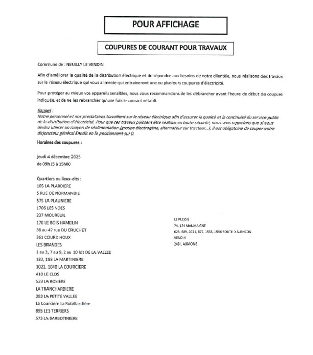 COUPURES DE COURANT POUR TRAVAUX LE JEUDI 4 DECEMBRE 2025 DE 9 H 15 à 15 H 00