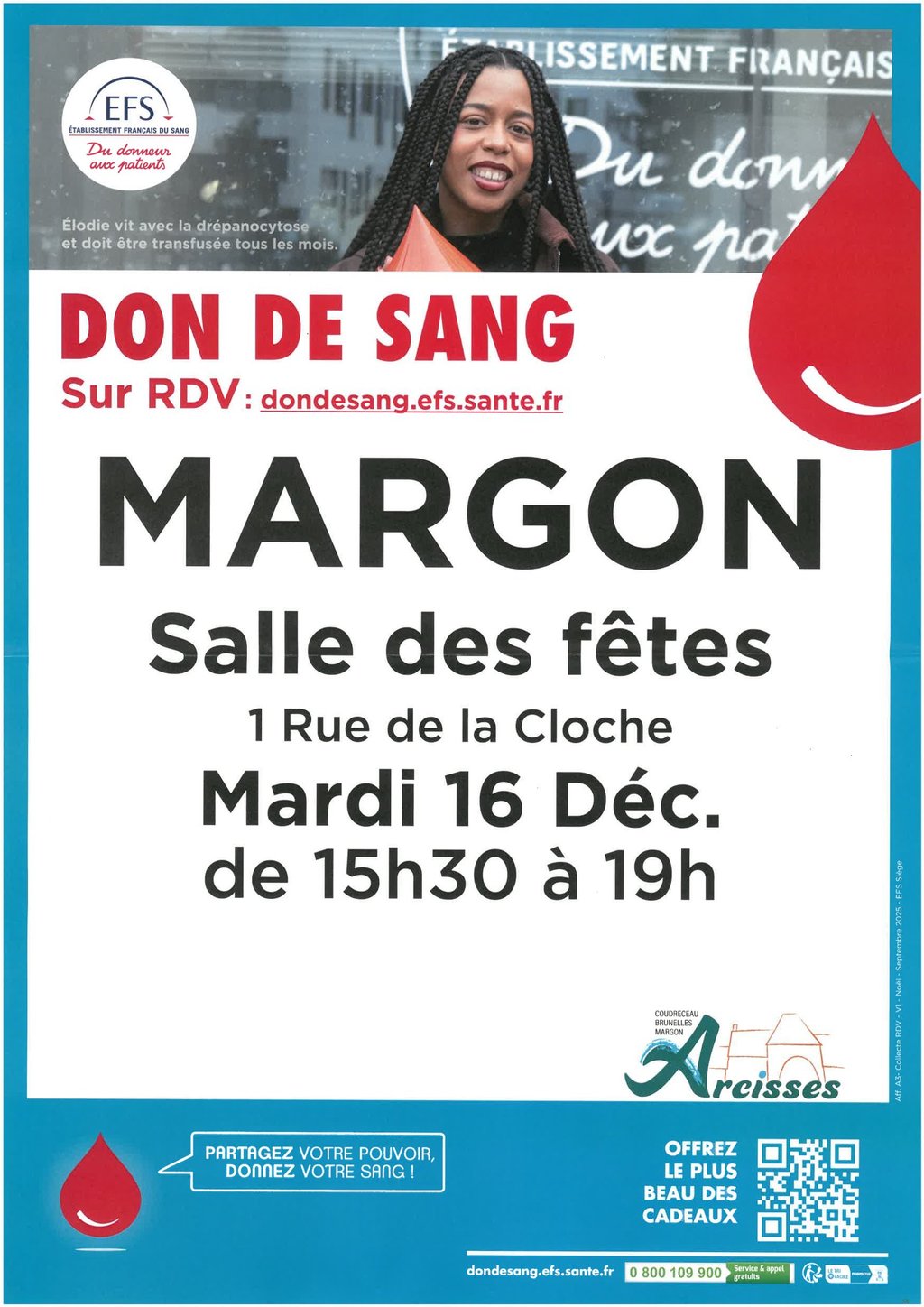 DON DE SANG À MARGON LE 16 DÉCEMBRE 2025 DE 15H30 À 19H