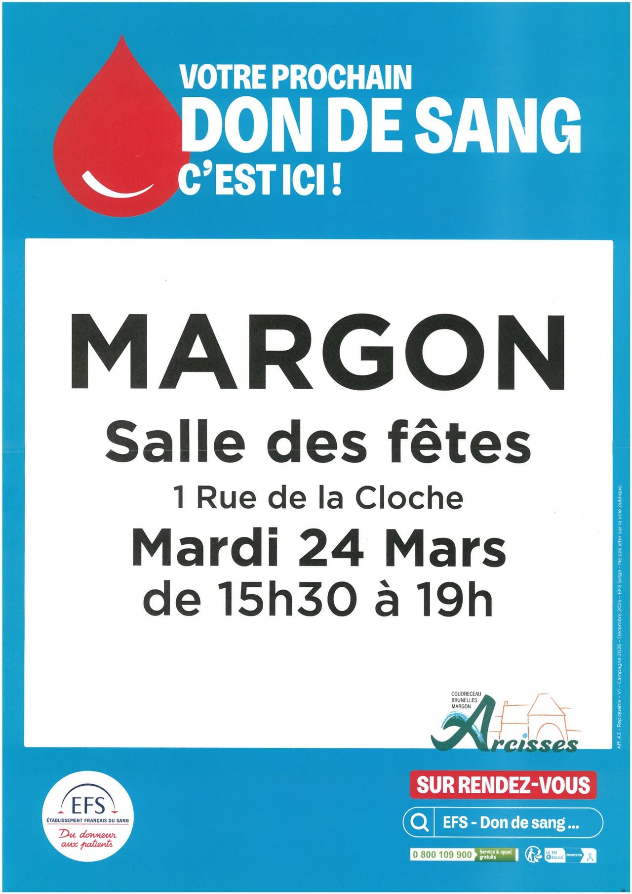 DON DE SANG À MARGON LE MARDI 24 MARS