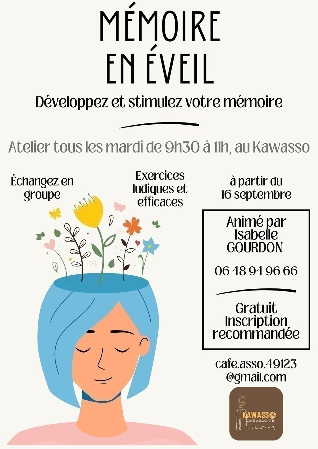 Tous les mardis matin (hors vacances scolaires), Isabelle animera un atelier Mémoire en éveil au café associatif de Champtocé-sur-Loire, Kawasso.