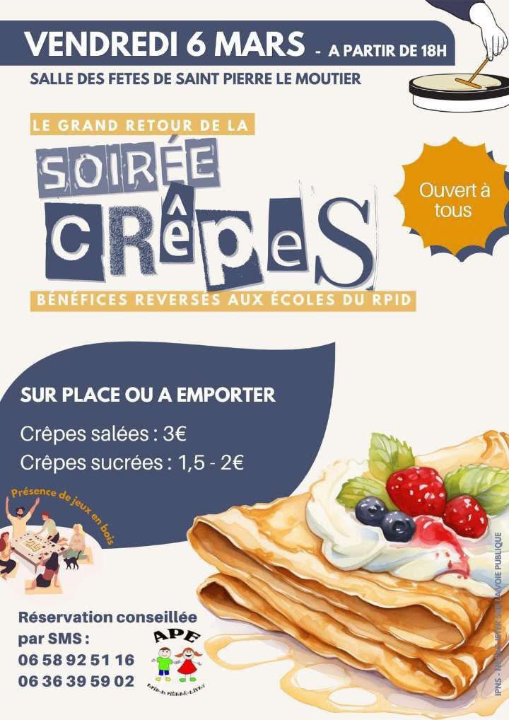 🥞 Le grand retour de la soirée crêpes organisée par l’APE du RPID Saint-Pierre-le-Moutier / Livry !