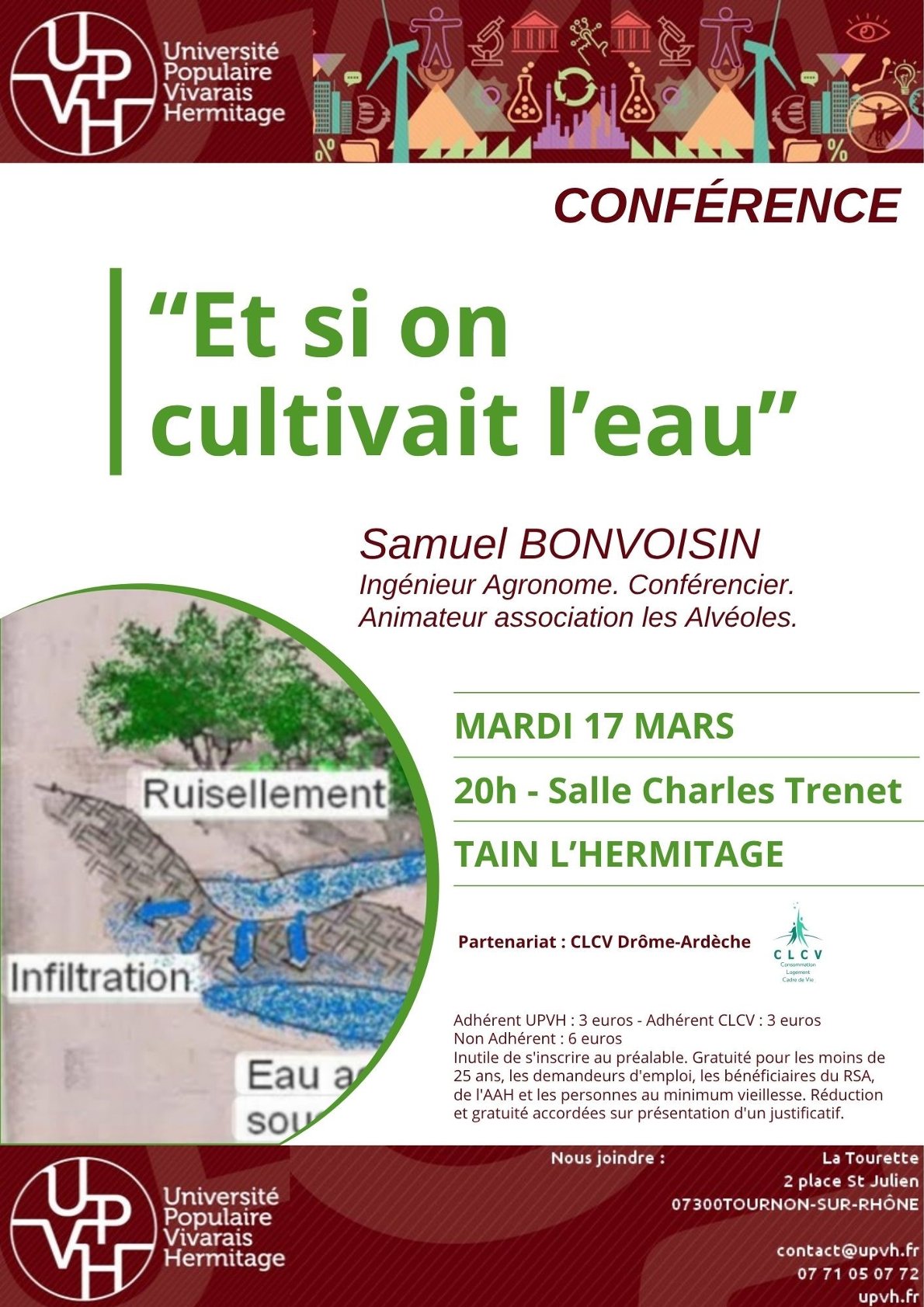 Dans le cadre de sa programmation les"Enjeux de l'eau", l'UPVH (Université Populaire Vivarais Hermitage) propose une conférence intitulée "Et si on cultivait l'eau", animée par Samuel BONVOISIN (ingénieur agronome)