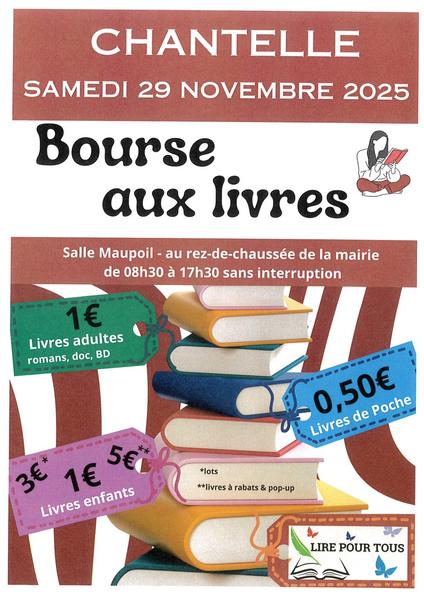 Grande bourse aux livres en continu. Livres adultes 1€, livres de poche 0,50€, livres enfants de 1€ à 5€. Organisé par Lire pour Tous.