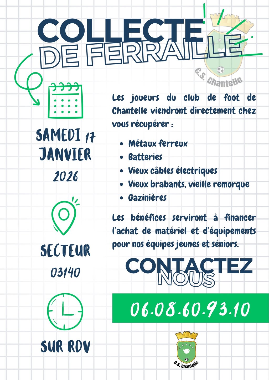 le C.S CHANTELLE organise une collecte de ferraille le 17 janvier 2026
