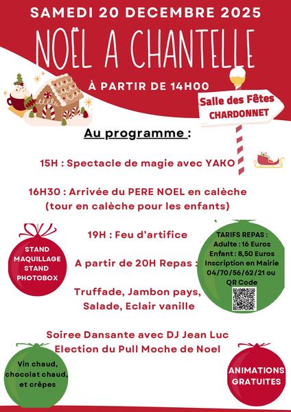 Vivez la magie de Noël à Chantelle le 20 décembre dès 14h ! Spectacle, arrivée du Père Noël, feu d’artifice, repas festif et soirée dansante : une journée inoubliable pour petits et grands !