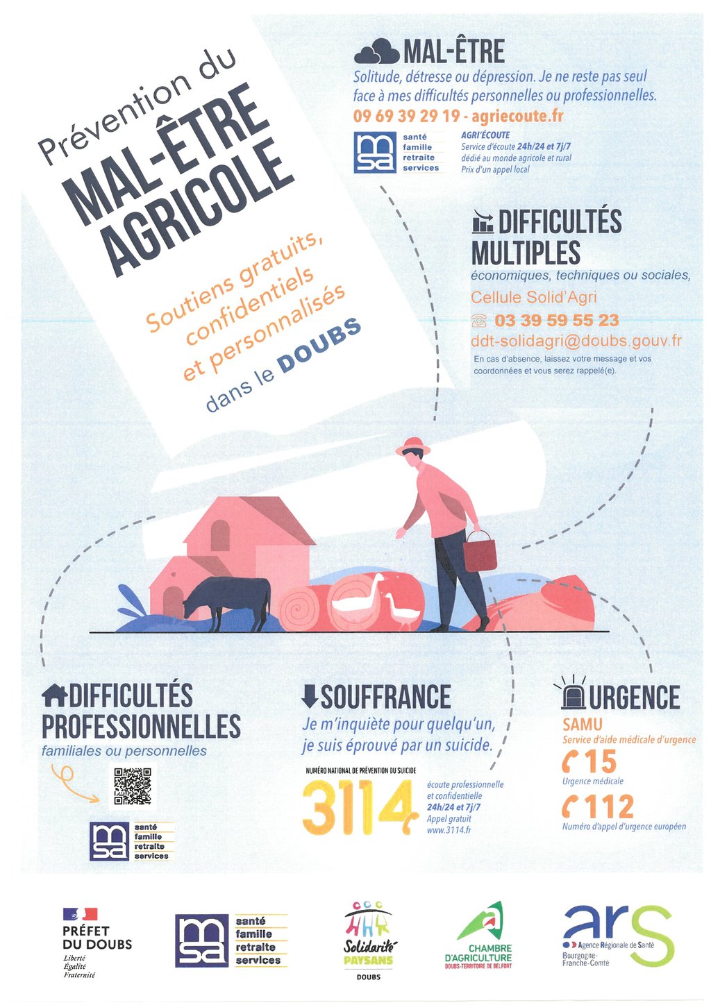 - Difficultés multiples (économiques, techniques ou sociales) : cellule Solid'Agri au 03.39.59.55.23 ou ddt-solidagri@doubs.gouv.fr