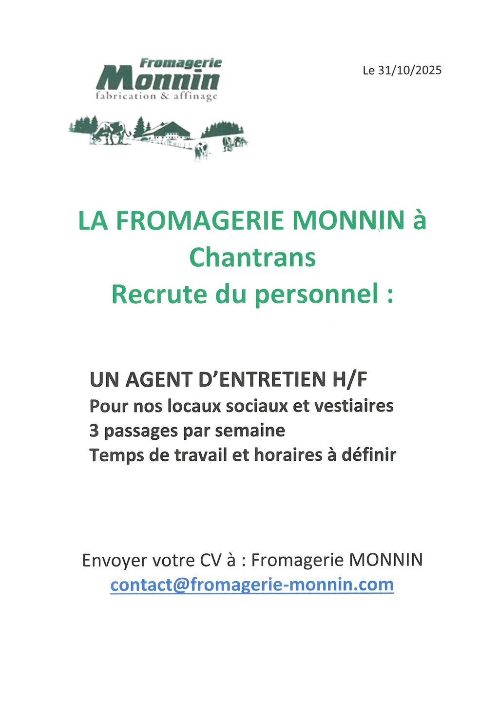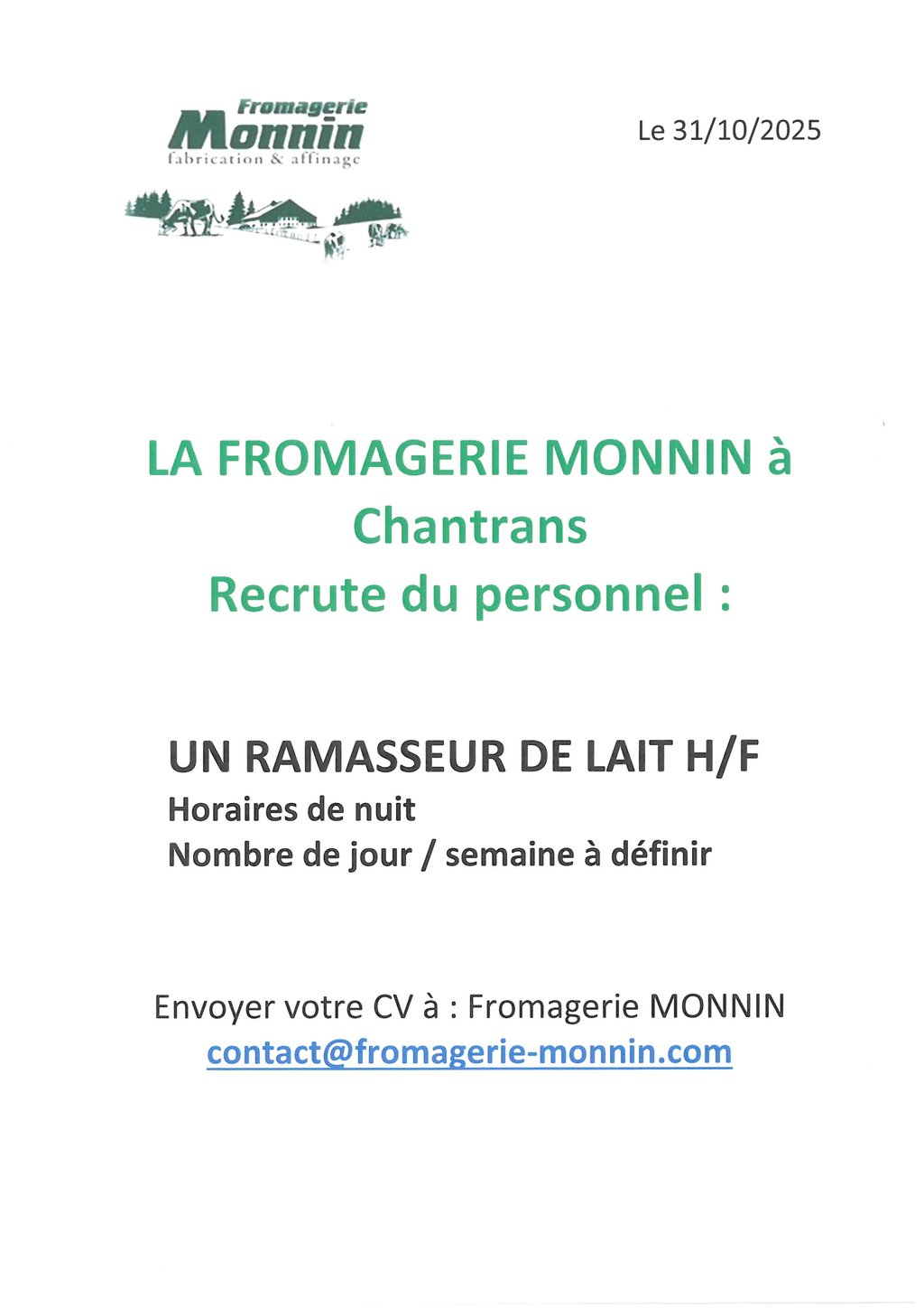 LA FROMAGERIE MONNIN À CHANTRANS RECRUTE DU PERSONNEL !