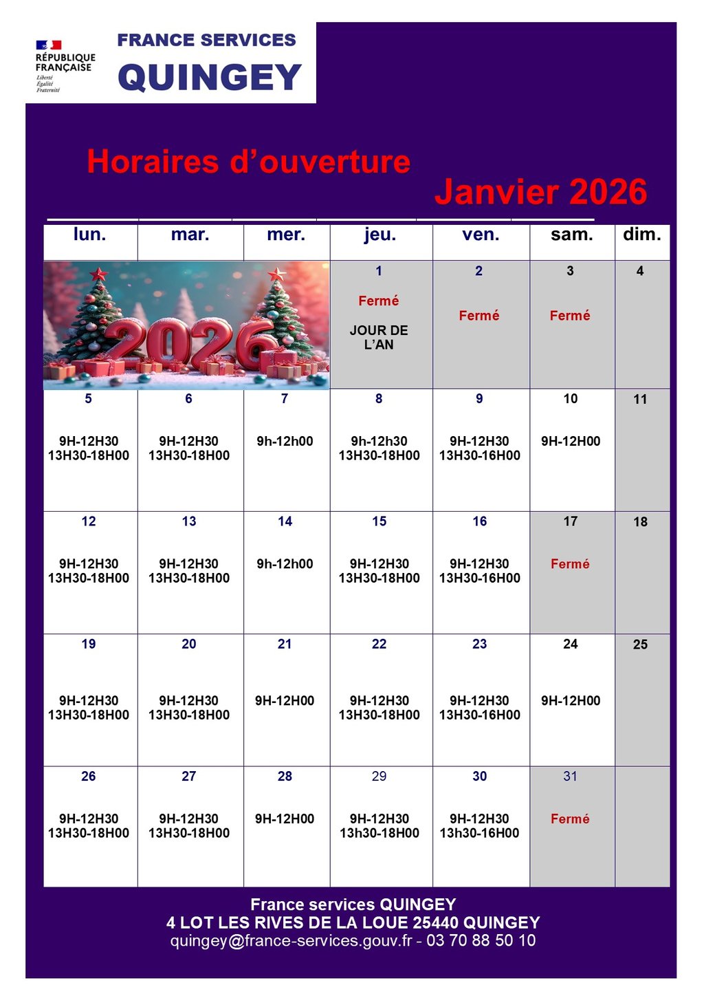 Horaires d'ouverture France Service pour le mois de janvier 2026