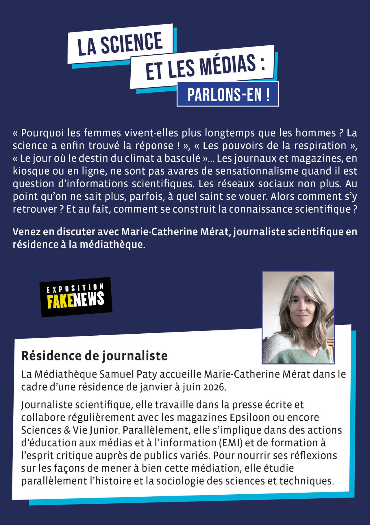 Venez en discuter avec Marie-Catherine Mérat, journaliste scientifique en résidence à la médiathèque.