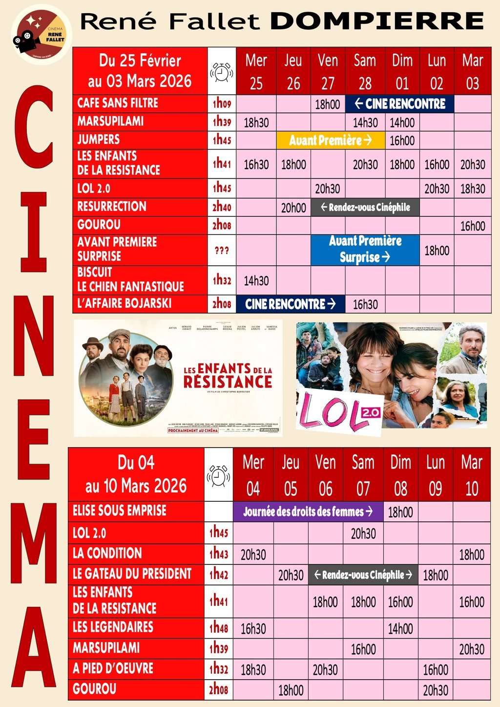 🎬​​​​​​​Programme de cinéma - du 25 février au 10 mars