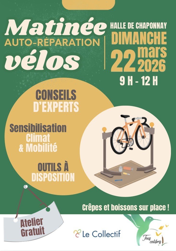 Début du printemps: ressortons nos vélos ! Le Collectif vous propose de mettre ses experts à disposition sous la halle de Chaponnay pour réparer, apprendre à entretenir votre vélo ! Tous Colibris sera aussi à nos côtés pour sensibiliser aux risques de la route mais aussi au climat et à l’importance de faire évoluer nos moyens de mobilité.