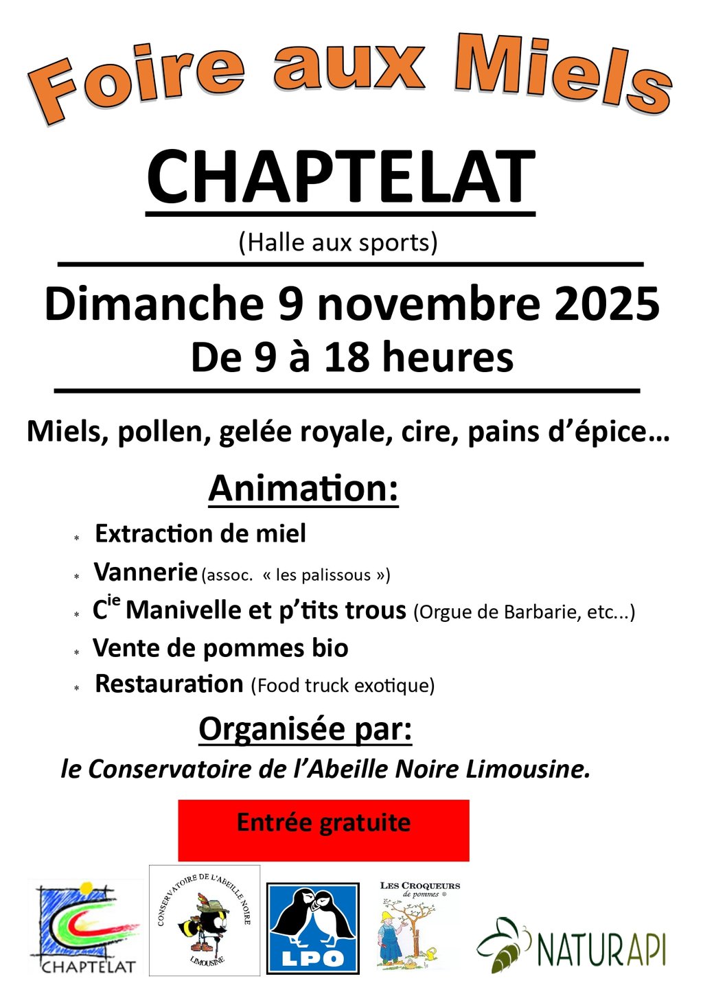 L'association Conservatoire de l'Abeille Noire Limousine organise sa foire aux miels le dimanche 09 novembre de 9h à 18h à la halle aux sports.