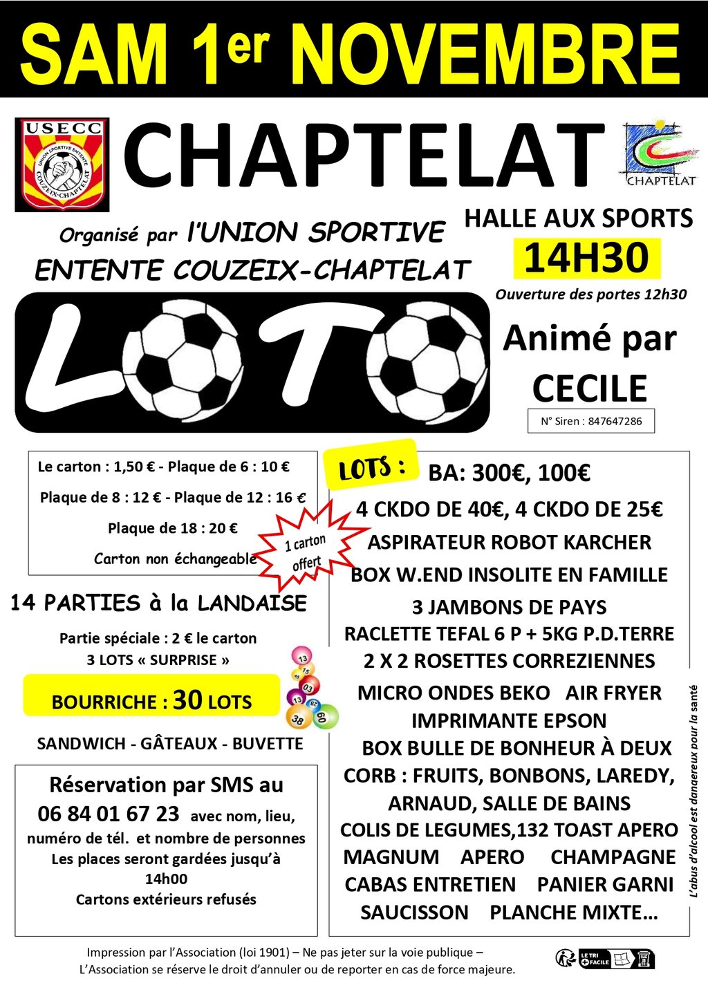 L'Union Sportive Entente Couzeix-Chaptelat oranaise un loto le samedi 01 novembre à la Halle aux sports.