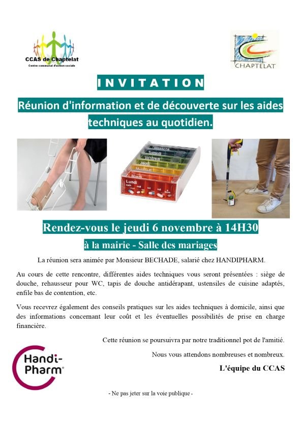 Le CCAS de la mairie de Chaptelat organise une réunion d'information et de découverte sur les aides techniques au quotidien le jeudi 6 novembre à 14h30 salle des mariages.