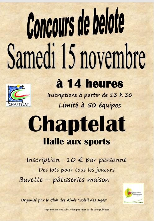 Le club des ainés "Soleil des âges" organise un concours de belote le samedi 15 novembre à la Halle aux sports à 14h00.