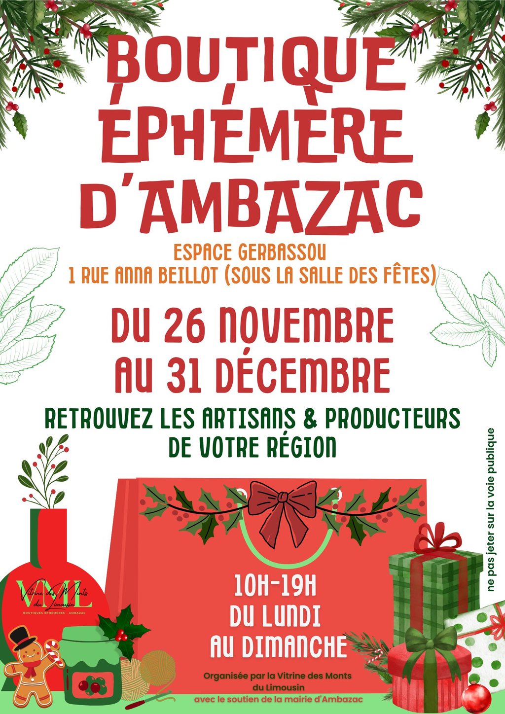 L’association "Vitrine des Monts du Limousin" est heureuse de vous annoncer l’ouverture prochaine de sa 6ème boutique éphémère de Noël,  du 26 novembre au 31 décembre 2025, du lundi au dimanche , 10h - 19h.