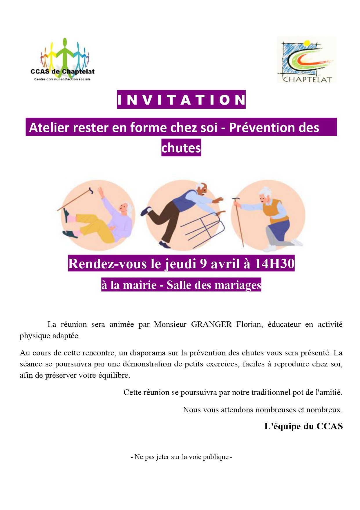 Le CCAS de la mairie de Chaptelat organise un atelier "rester en forme chez soi - prévention des chutes" le jeudi 9 avril à 14h30 salle des mariages.