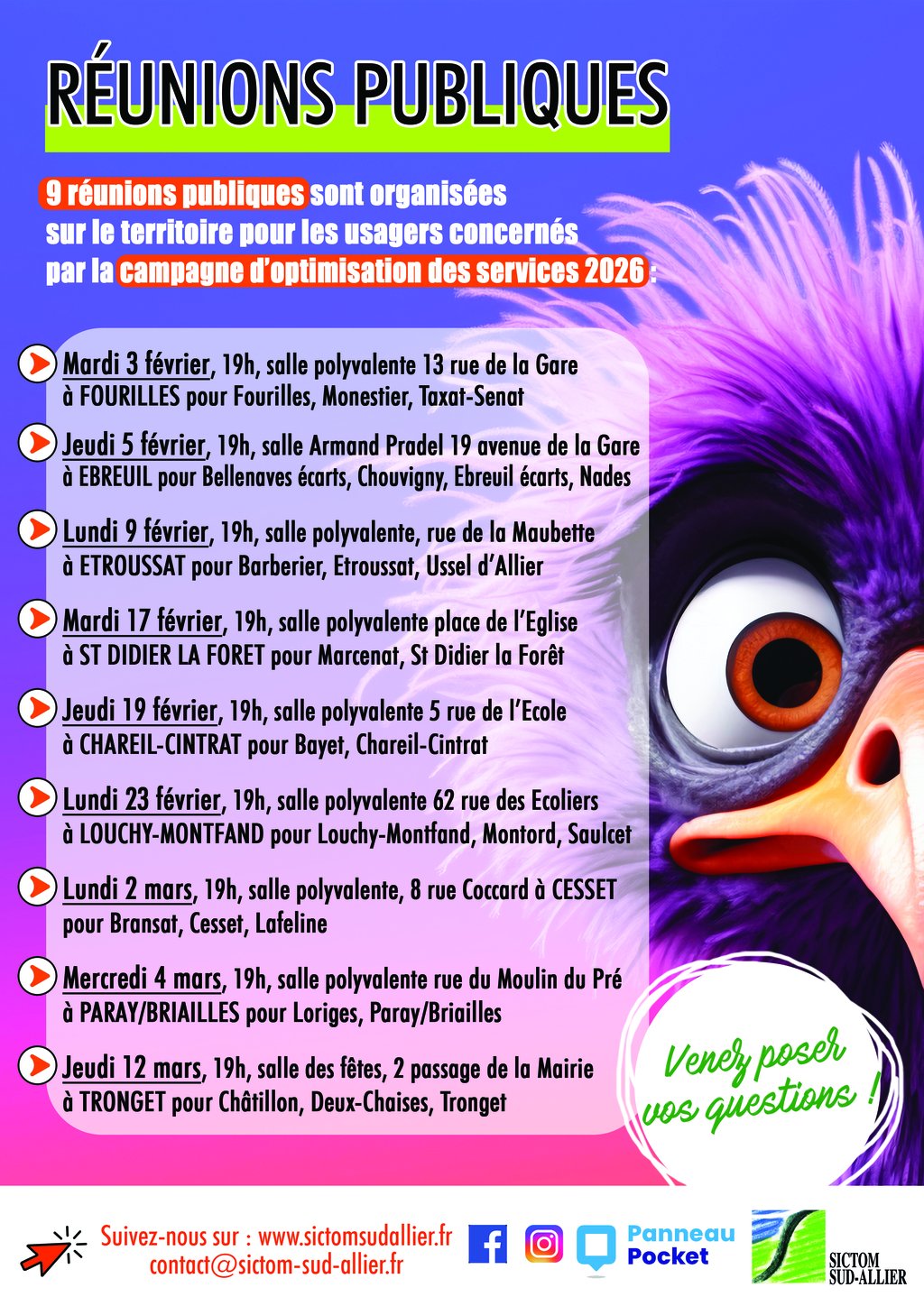 Des réunions d'informations sont organisées par le SICTOM dans différentes communes, celle de CHAREIL-CINTRAT ayant lieu le jeudi 19 février à 19h à la salle polyvalente.