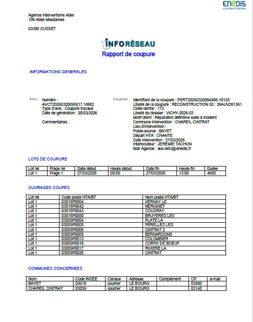 une coupure du réseau électrique est programmée sur les communes de Chareil-Cintrat et Bayet, le vendredi 27 mars prochain entre 09h00 et 13h00 dans le cadre des travaux de reconstruction du réseau électrique suite aux incidents climatiques de juin 2025
