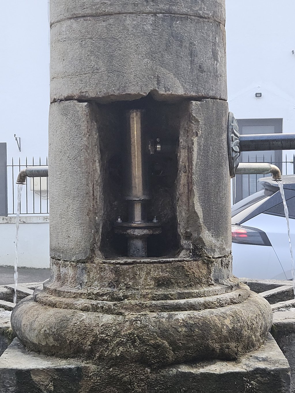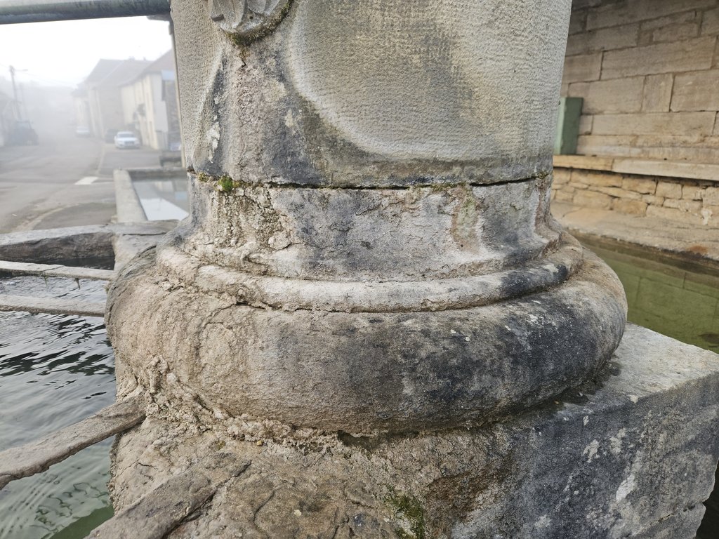 Il y a très longtemps déjà, des fuites étaient apparues à l’intérieur de la colonne de la fontaine. À l’époque, une réparation avait été réalisée à l’aide d’une petite gâchée de ciment. Avec le temps – et après de très nombreuses années – ce ciment n’était plus étanche. L’eau s’infiltrait alors entre les pierres de la colonne.