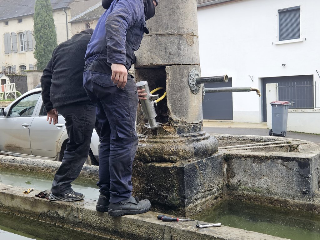 Dans le même temps, l’intérieur des tuyaux d’écoulement a été entièrement repris et retuyauté jusqu’aux buses. L’objectif était d’obtenir des jets d’eau droits et maîtrisés, évitant ainsi que l’eau ne ruisselle en permanence sur les pierres, ce qui les abîme et les fragilise avec le temps.
