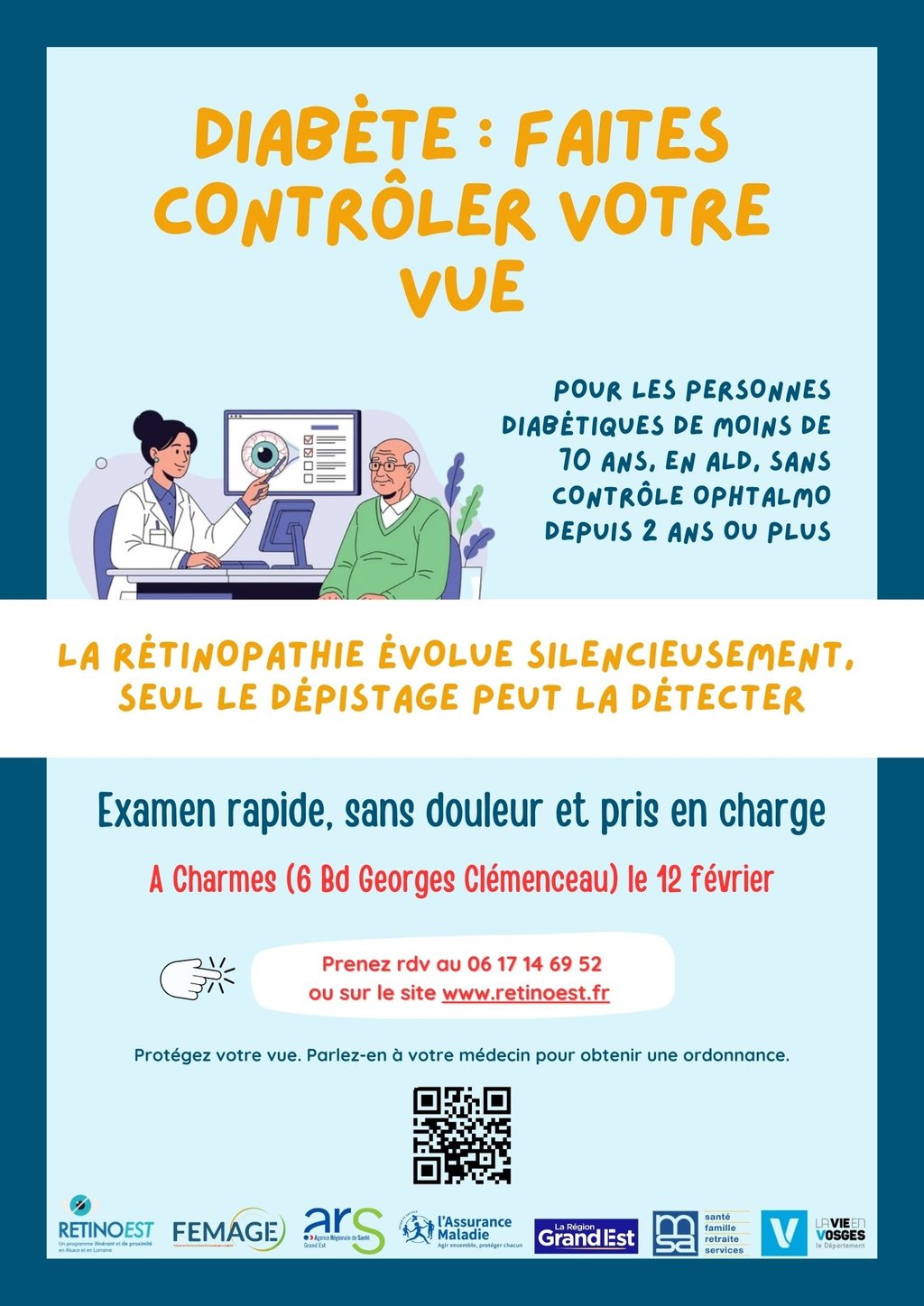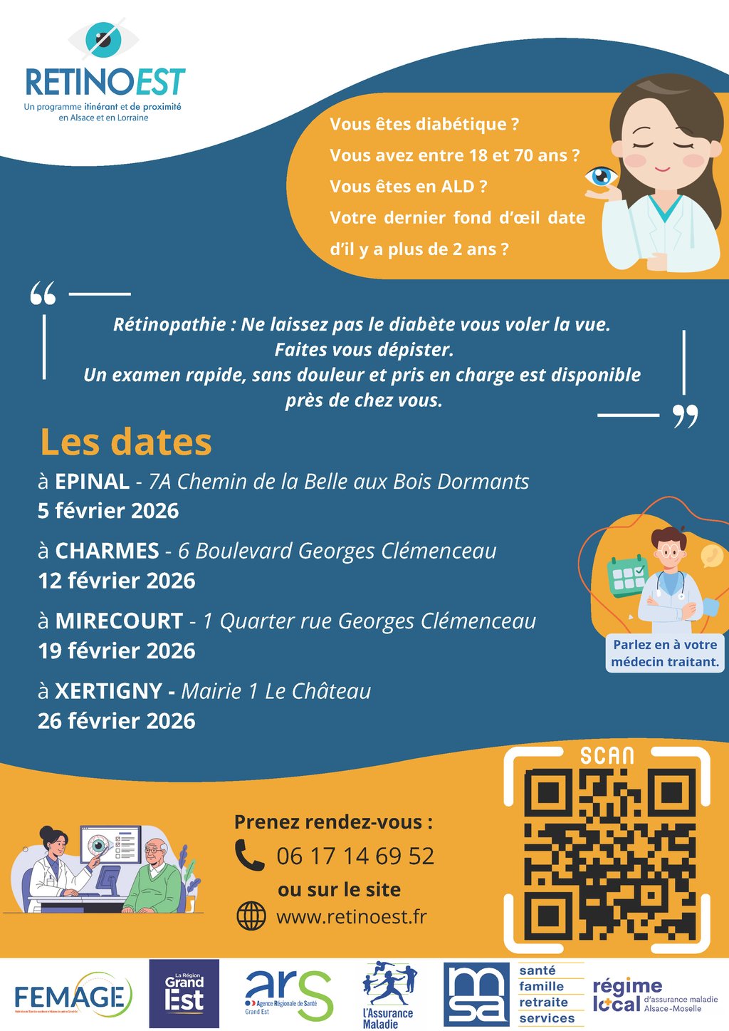 Pour un dépistage gratuit, vous pouvez prendre rendez-vous dès maintenant au 06 17 14 69 52 ou sur le site internet www.retinoest.fr
