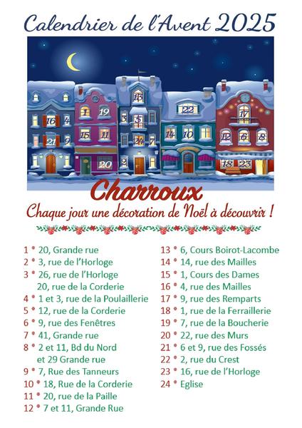 24 fenêtres, 24 surprises, 24 moments de magie. Rendez-vous dans les rues de Charroux pour vivre ensemble l’attente de Noël !