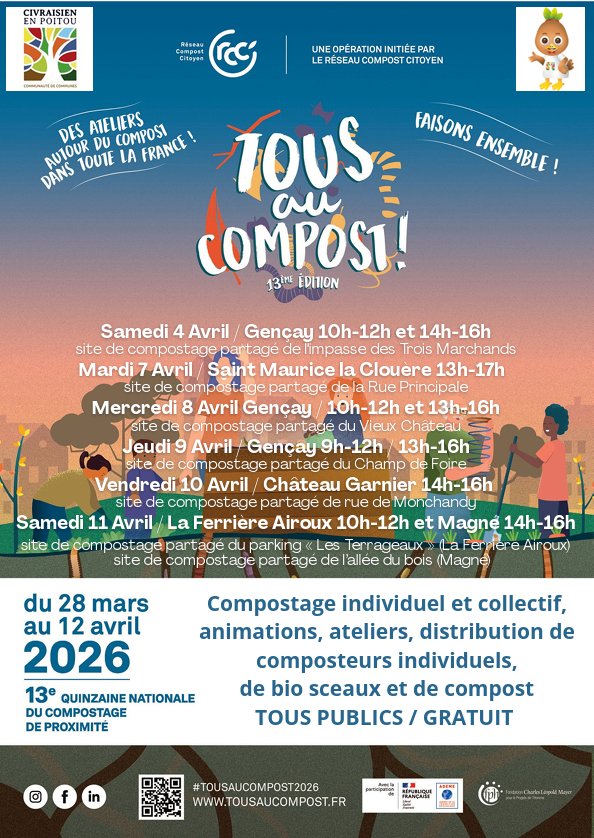 Du 28 mars au 12 avril 2026, la Communauté de communes du Civraisien en Poitou participe à la Quinzaine nationale du compostage de proximité avec plusieurs rendez-vous ouverts à tous !