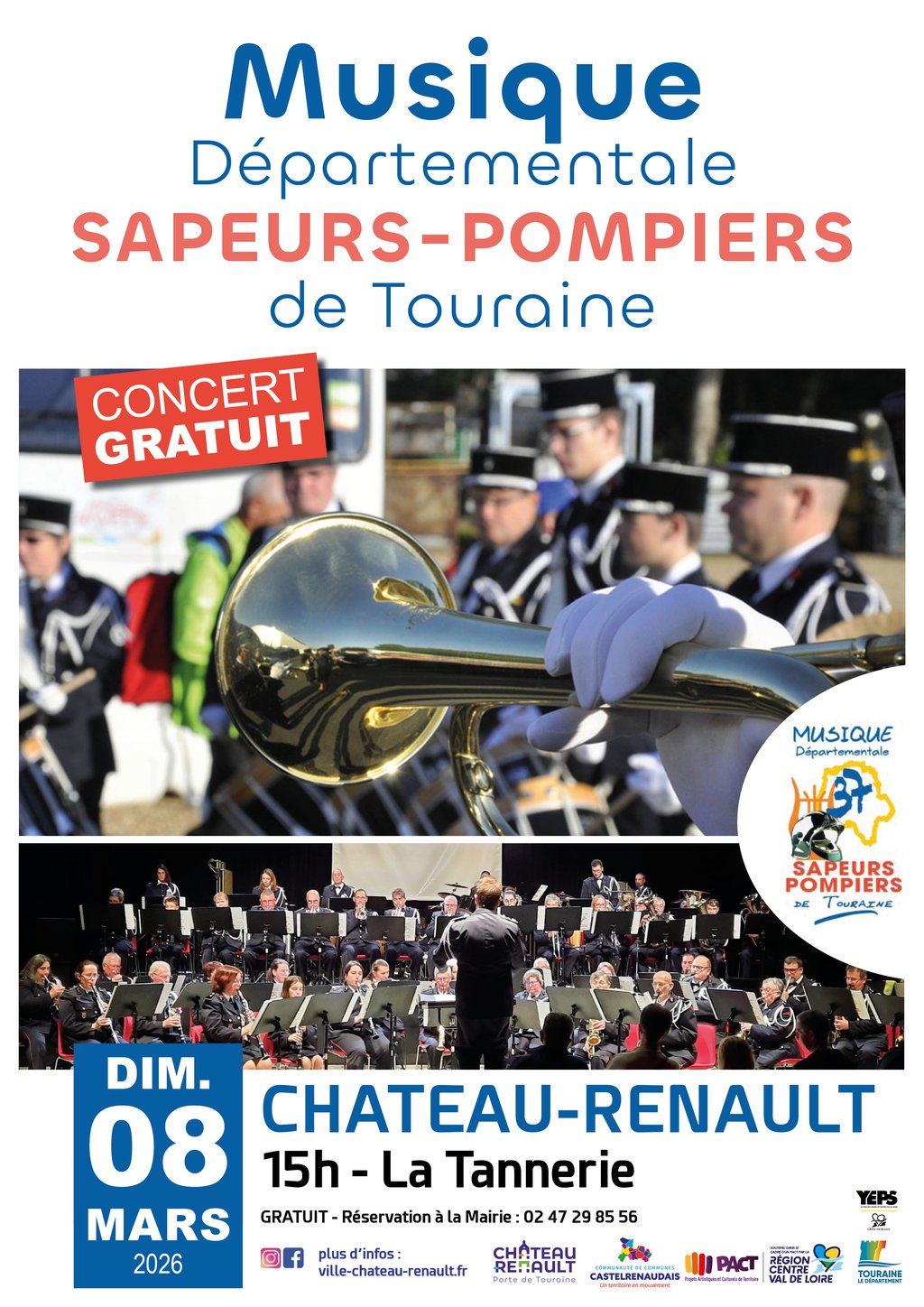 À la fois traditionnelle et d’avant-garde, la musique départementale des sapeurs-pompiers de Touraine regroupe des gens de la profession et des musiciens tous bénévoles qui ont choisi de servir la cause musicale. De concerts en festivals, cette formation continue de représenter brillamment l’école française d’orchestre à vent et de donner des sapeurs-pompiers une image de marque de qualité qui dépasse au fil des ans le cadre de notre département.