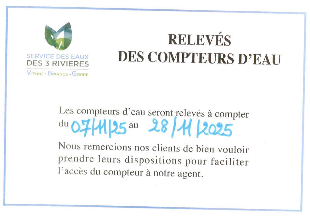 Les compteurs d'eau seront relevés à compter du 07/11/25 au 28/11/25.