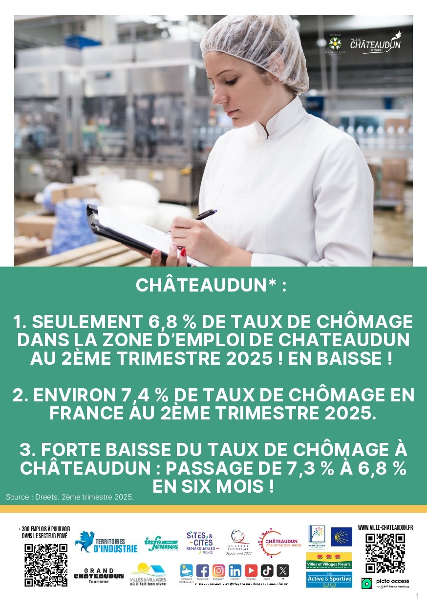 La ville de Châteaudun est en plein essor avec 10 410 emplois privés au 2ème trimestre 2025, et une évolution de + 1,8 % sur un an au 2ème trimestre 2025 (avec 73 entreprises industrielles dans le Grand Châteaudun comme Safran Aerosystems, Vorwerk, Rotatron, FranceMetal, Composites et Technologies, Themis, SMC, Ebly, etc..). Avec désormais 10 410 emplois dans le secteur privé, la zone de Châteaudun a vu une progression spectaculaire de + 140 emplois en un an !