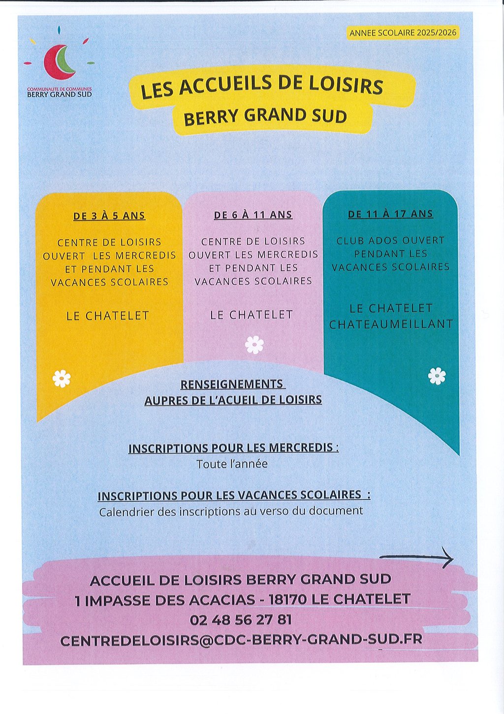L'accueil de loisirs Berry Grand Sud est ouvert toute l'année (mercredis et vacances scolaires) pour les enfants de 3 ans à 11 ans et le club ados (de 11 ans à 17 ans) pendant les vacances scolaires
