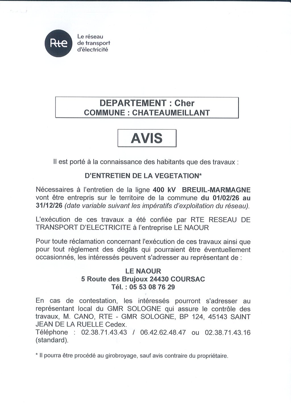 Travaux d'entretien végétation de la ligne 400 kV BREUIL-MARMAGNE du 01/02/26 au 31/12/26.