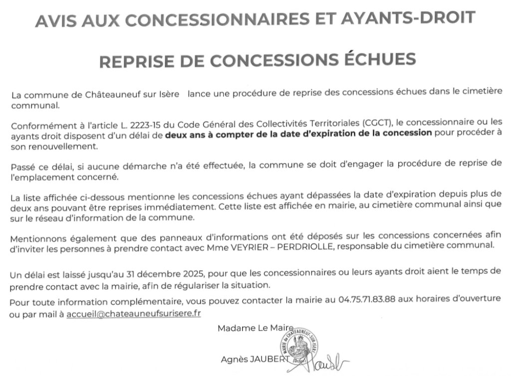 La commune de Châteauneuf-sur-Isère lance une procédure de reprise des concessions échues dans le cimetière communal.