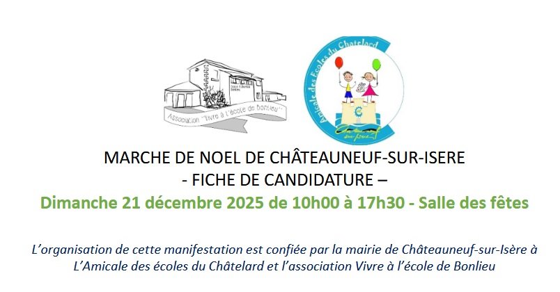 Les associations "Vivre à l'école de Bonlieu" et "Amicale des écoles du Châtelard" organisent le marché de Noël qui aura lieu le dimanche 21 décembre de 10h à 17h30 à la salle des fêtes.