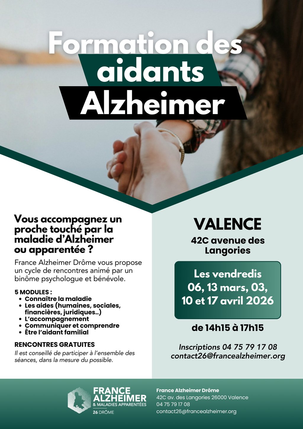 - Les vendredis 06, 13 mars, 03,10 et 17 avril 2026 de 14h15 à 17h15 au siège de notre association à Valence