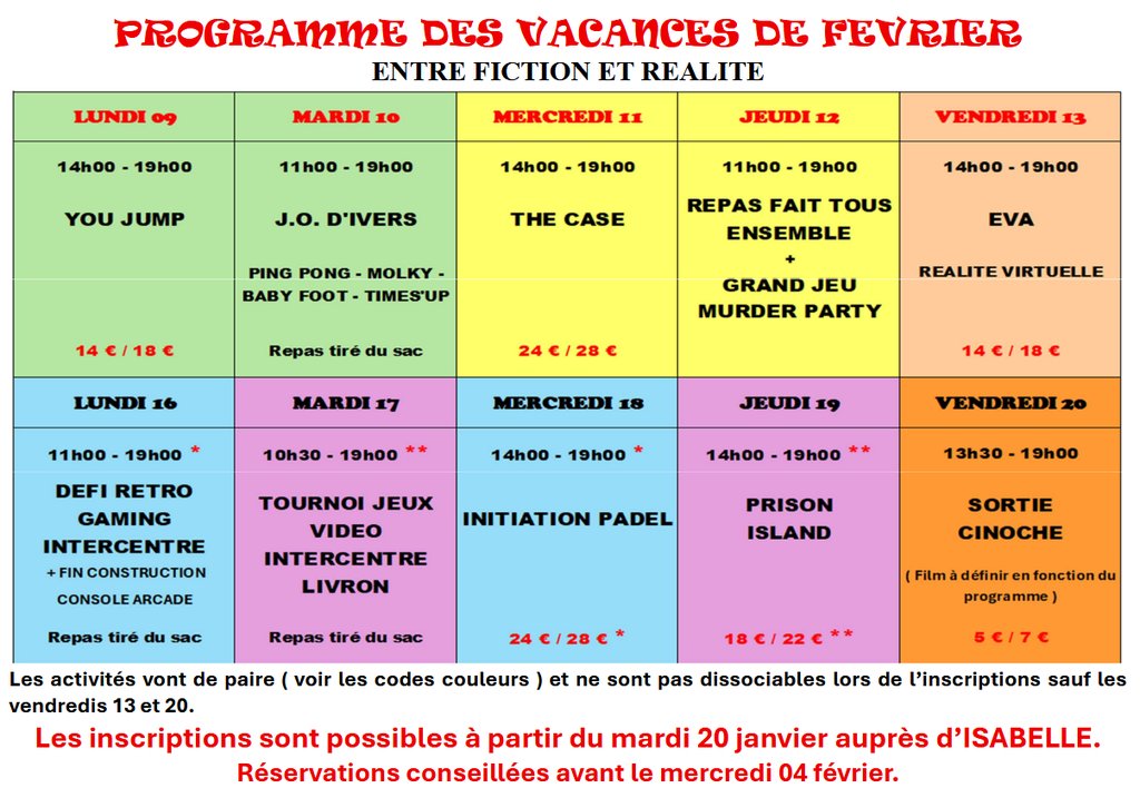 Le foyer de la MJC de Châteauneuf organise pour les ados de multiples activités pendant les vacances de février « Entre fiction et réalité ». Voir le code couleurs. Les inscriptions sont ouvertes à partir du 20 janvier, tous les après- midis à la MJC.