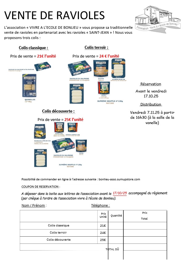 L'association "Vivre à l'école de Bonlieu" vous propose sa traditionnelle vente de ravioles en partenariat avec les ravioles "SAINT JEAN" !