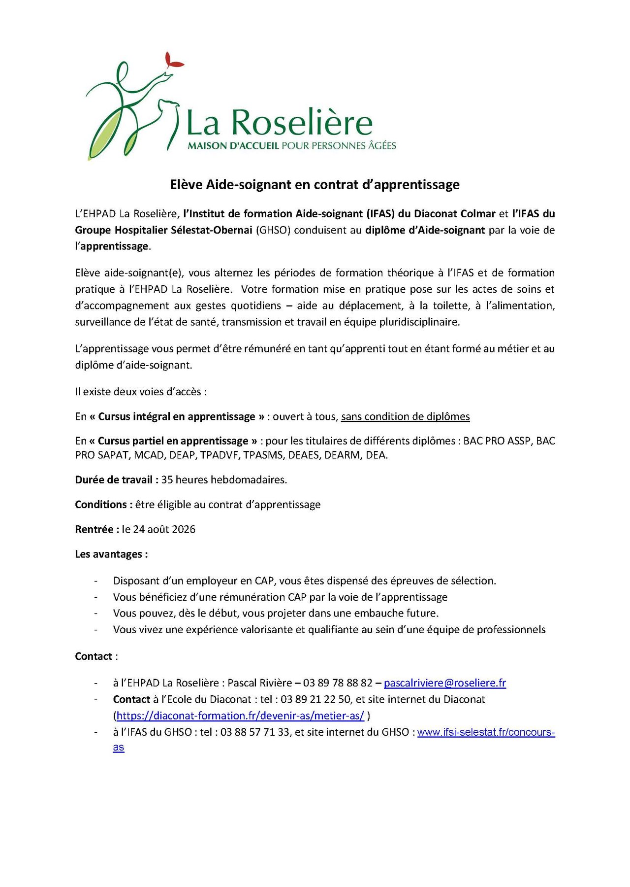 L’EHPAD La Roselière, l’IFAS du Diaconat de Colmar et l’IFAS du Groupe Hospitalier Sélestat-Obernai proposent une formation au Diplôme d’Aide-Soignant par la voie de l’apprentissage en alternernant entre formation théorique à l’IFAS et formation pratique à l’EHPAD La Roselière.