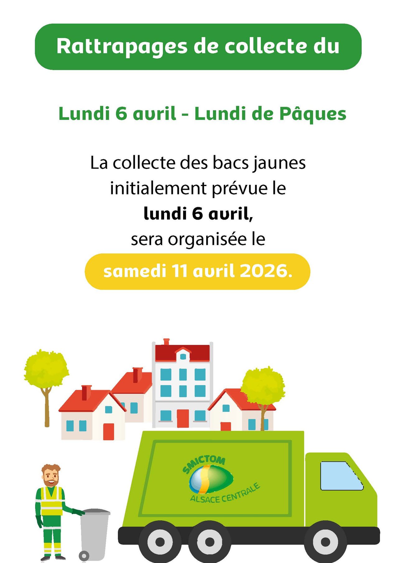 Le lundi 6 avril 2026 étant férié, la collecte du bac jaune n’aura pas lieu ce jour-là. Elle sera organisée le samedi 11 avril 2026.
