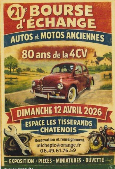Dimanche 12 avril de 8h à 18h à l’Espace Les Tisserands, venez découvrir la 21ème édition de la bourse d'échange de motos et voitures anciennes.