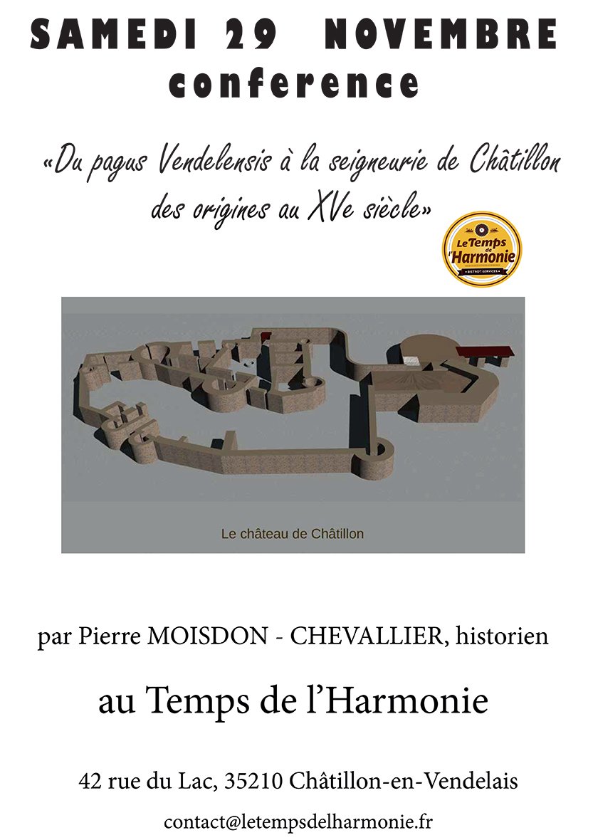 Pierre Moisdon-Chevallier, historien chatillonnais, qui vient de sortir l'ouvrage Actes de l’abbaye Notre-Dame de Melleray (1142-1296) aux Presses Universitaires de Rennes, revient nous présenter sa conférence sur l'histoire de Châtillon. Avec de récents ajouts, celle-ci est intitulée "Du pagus Vendelensis à la seigneurie de Châtillon des origines au 15ème siècle".