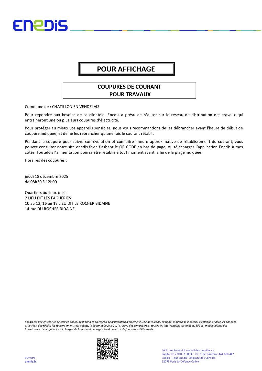 Coupures de courant prévues le 18 décembre entre 8 h 30 et 12h 00.