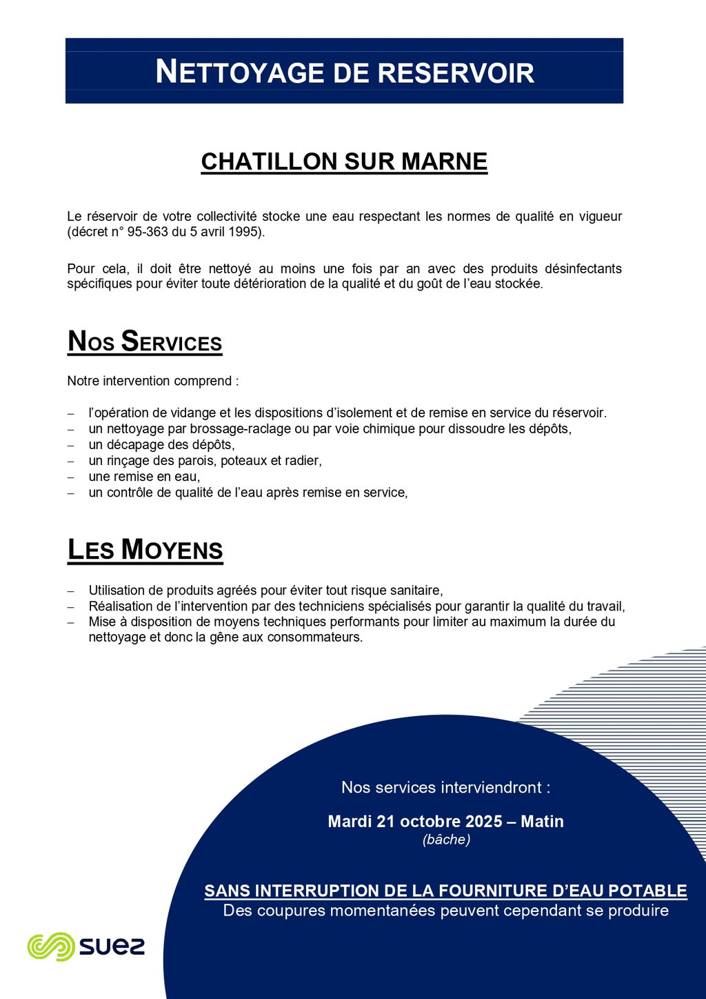 "Le nettoyage de réservoir d'eau" de la commune aura lieu le mardi 21 octobre 2025 Sans interruption de la fourniture d'eau potable. Des coupures momentanées peuvent cependant se produire.