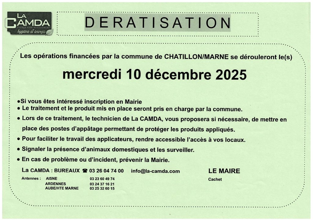 Si vous avez besoin de la dératisation merci de contacter le secrétariat de mairie au 03 26 58 34 25 avant le mardi 9 décembre 12h00